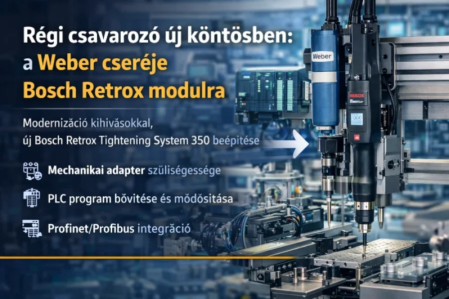 Egy gyártó partnerünk automatizált szerelőállomásán aktuális feladatként a régi Weber csavarozó orsó és vezérlés cseréje vált szükségessé. Az új Bosch Retrox Tightening System 350 beépítése mellett döntöttünk, amely megbízhatóságával és modern technológiájával új szintre emeli a csavarozási folyamatokat. Az átállás azonban korántsem ment zökkenőmentesen.